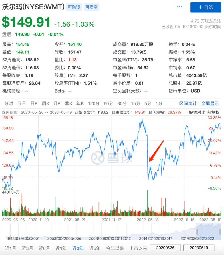目前股价虽呈逐渐回升趋势,但仍未完全恢复至去年同期股价暴跌前的水平。彼时由于糟糕的2023财年Q1业绩表现,沃尔玛收盘跌幅达到11.4%,创下自1987年以来的最大单日跌幅。