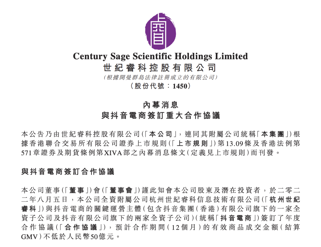 抖音仍然是交个朋友的大本营,去年8月,交个朋友港股上市主体世纪睿科发布公告称,与抖音电商签订年度合作协议,预计合作期间(12个月)的有效商品成交金额(结算GMV)不低于50亿元。这也就意味着,交个朋友若要完成合作协议,必须要把重心放在抖音上。