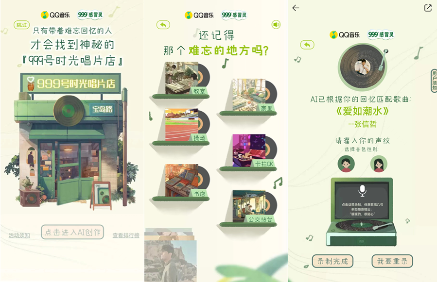 教室、家里、操场、卡拉OK、书店、公交车站,999感冒灵选用了六个很容易击中人心的地点做选项,让用户跟着回忆选择想要回去的地方,当那些和音乐有关的场景浮现,某天某地某人,用户很快就有了代入感——在公交车上:“好糗!不小心跟着唱出声了”“并肩坐在后排,耳机一人一半”;在教室里:“单手托着下巴上自习不叫耍帅,这叫耳机隐藏术”......选择完属于自己的回忆,唱片店为你专属定制的经典曲目,就会通过“AI声纹技术”和你的声音结合。