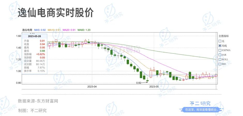 5月17日,逸仙电商一季报公布后的首个交易日,其股价上涨1.15%,截至美东时间5月26日美股收盘,逸仙电商报收0.94美元/股(折合人民币6.65亿元),对应市值5.26亿美元(折合人民币37.23亿元)。较发行价10.5美元/股跌超90%;对比今年的高点1.82美元/股,市值已蒸发50%。