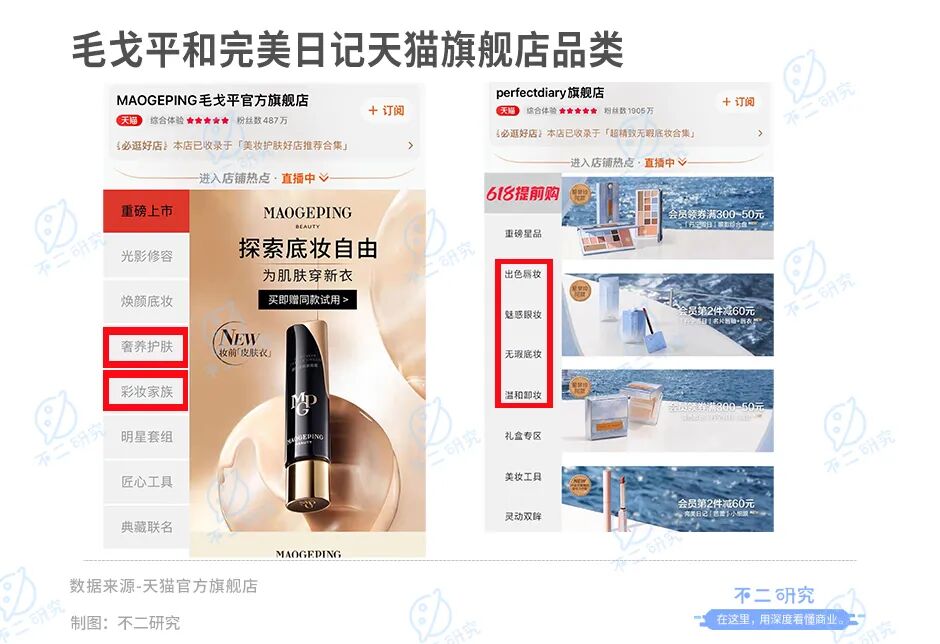 从天猫旗舰店商品分类来看,主品牌MGPIN和完美日记都已打造了彩妆+护肤的产品品类闭环。