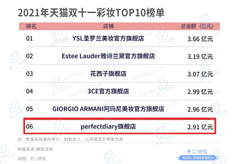 2019年双十一,成立仅两年多的完美日记赶超雅诗兰黛、YSL、MAC等国际大牌,成为“双十一”首个登顶天猫彩妆销量榜榜首的国货品牌;2020年,完美日记荣登天猫彩妆销量榜第二名;2021年,完美日记位列天猫“双十一”彩妆销量榜的第六;2022年,完美日记首次跌出双11预售TOP10。