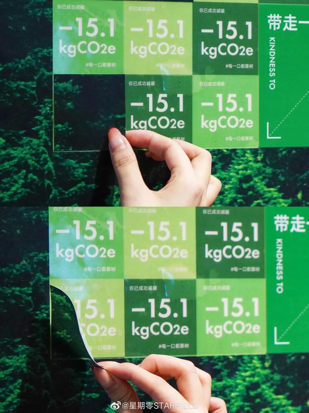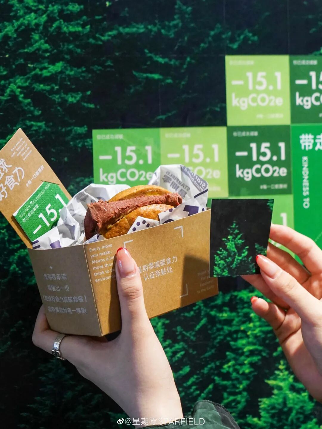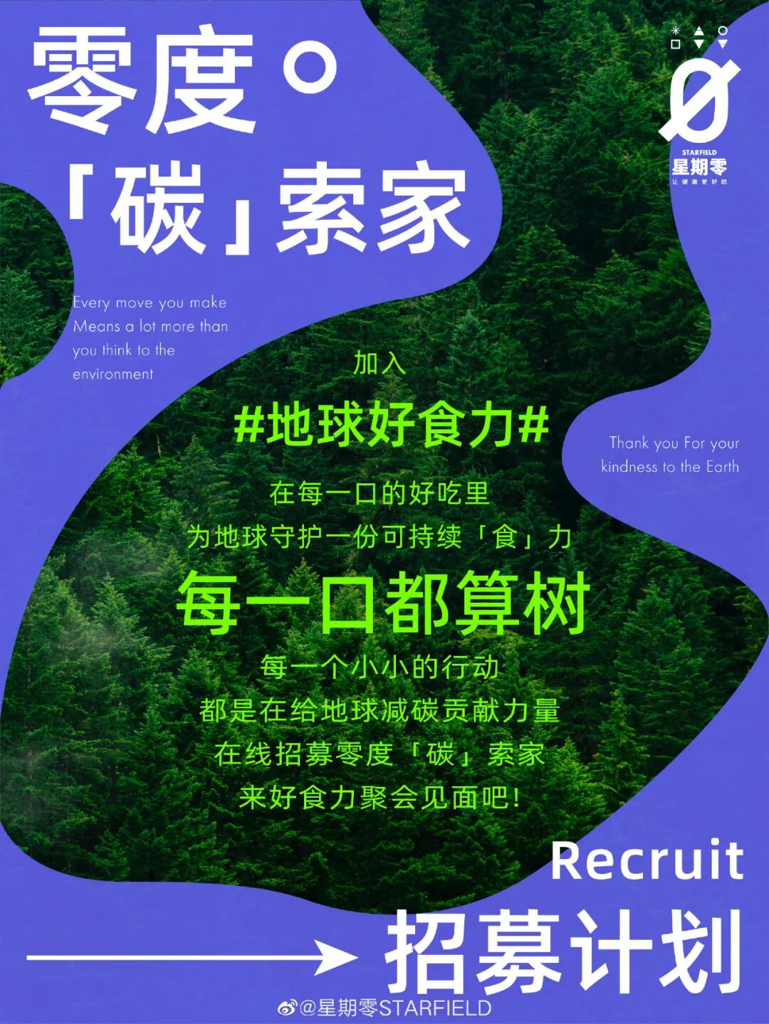 在黑马看来,品牌做环保议题的沟通至少要具备两个前提:一是获得感,在于激励大众的行为;二是感知力,在于体现品牌的号召力。在如今这个万事万物皆可成为环保议题的背景下,提供感知价值则是难上加难。星期零则是通过日常的“食”进行破题。在活动上线之前,星期零先是将直观的减碳数据和植物肉产品相结合,以主题海报的形式述星期零如何以“食力”为减碳做贡献:食用1片星期零黑胡椒植物牛肉片相当于约10棵树1天所吸收的碳排放,消耗1000万份黑胡椒植物牛肉片餐品,约有近564570棵树一年产生的碳汇量。惊人的数据和对比,更具象的让消费者认知到星期零植物肉这个产品对于个体和社会的价值。无形之中,也调动网友对于植物肉产品的讨论和推广。由此,星期零通过嵌入日常的“食”,让环保的理念水到渠成。而作为一种食物,星期零植物肉则是理念传达的叠加buff,由此用户获得的不仅的减碳产品,更是一种可持续、可感知的减碳价值观。