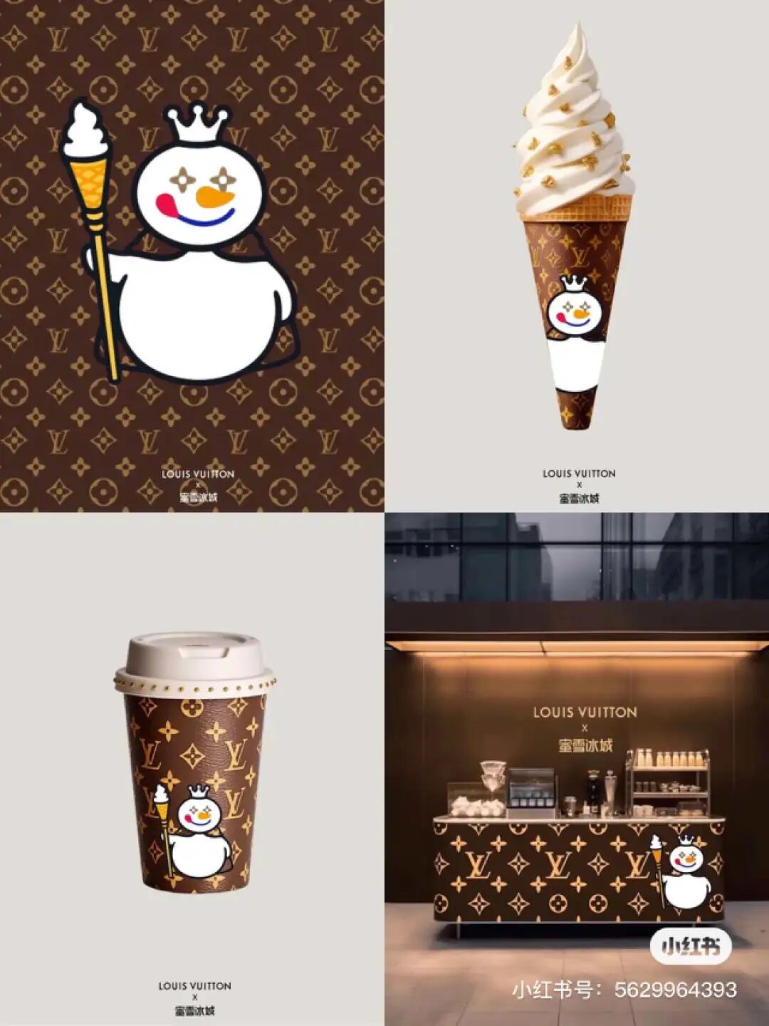 最近刷到网友用AI做了张蜜雪冰城和LV联名的联名假图,评论区大家还以为雪王真的攀了高枝儿,“柠檬水不得卖40?”但很快被另一个声音说服了:万一雪王价格打下来了呢