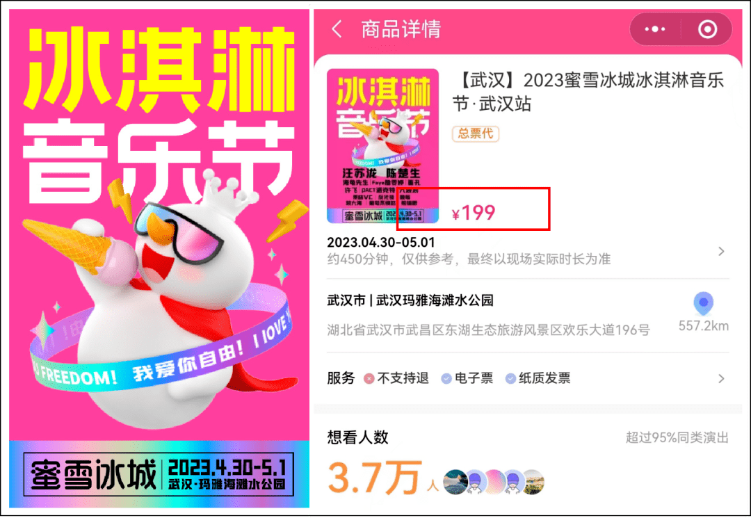 比如前段时间刚结束的蜜雪冰城音乐节,以199的票价从599、699、999的“韭菜”音乐节中脱颖而出。199的价格按照现在的行情只够请山寨周杰伦,蜜雪冰城请来许飞、大波浪、陈楚生、汪苏泷。