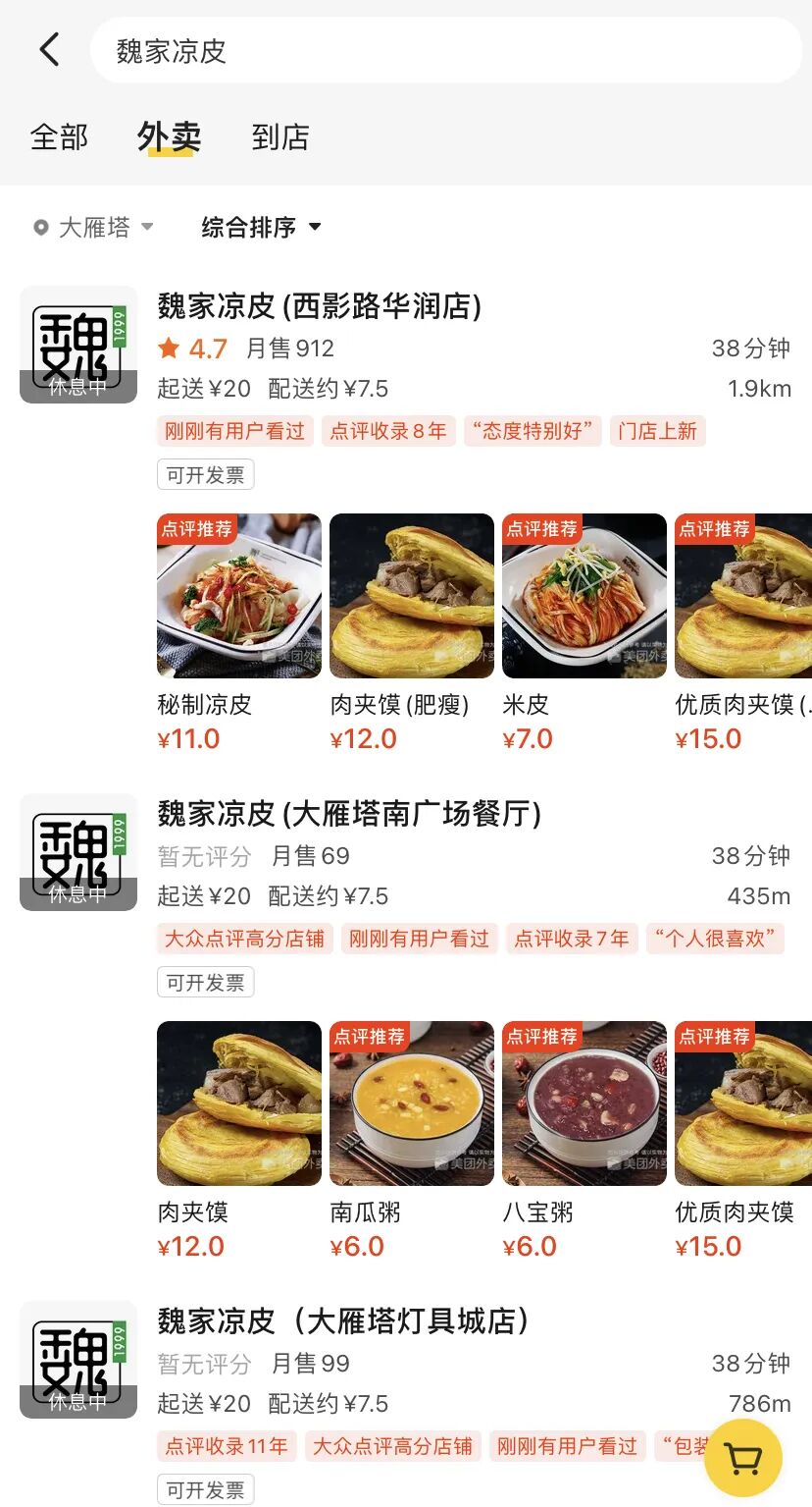 在美团app上,笔者尝试将地位改为西安大雁塔附近也发现,魏家凉皮所有门店均无法点餐,或显示“休息中”,或“暂停营业”,点开具体门店也是“已打烊”。