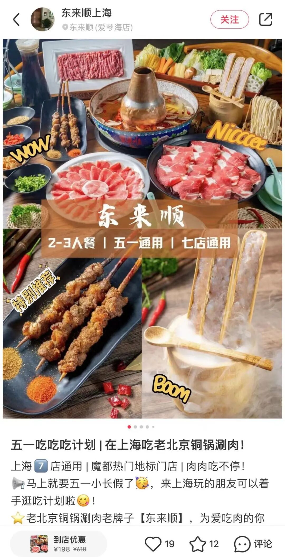 小红书账号“东来顺上海”在4月24日发布首条笔记,并挂了“到店优惠”链接,链接内容为198元的2-3人套餐。另外,小红书为商家主页设置了“门店团购”板块,点击进入后可查看商家门店列表,各个门店主页同样展示团购套餐。