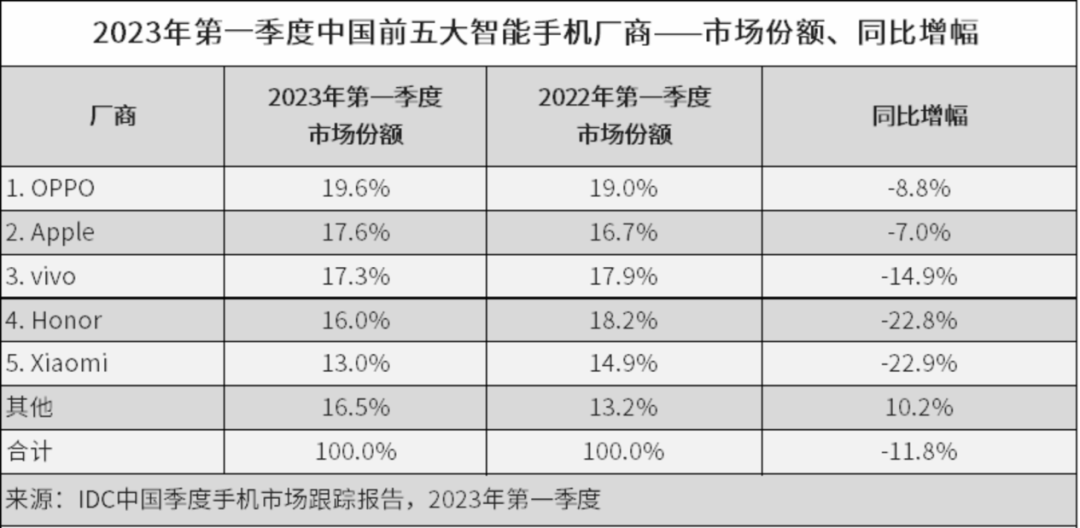 手机整体出货量持续萎缩是不争的事实,根据IDC发布的数据,2022年中国智能手机市场出货量约2.86亿台,同比下降13.2%,创下有史以来最大降幅。到2023年情况依然没有好转,一季度出货量约6544万台,同比下降11.8%。从2022年开始,中国手机市场保持着每季度10%以上的下降幅度。