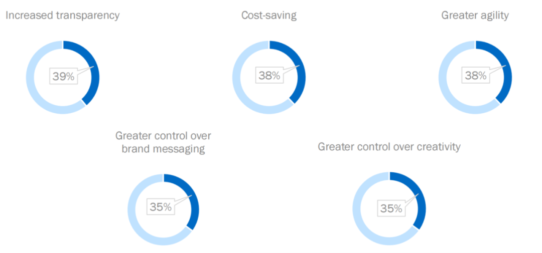 自2023年最新数据显示,82%的美国广告主协会(Association of National Advertisers)的会员公司都有了自己的In-house代理团队。趋向于In-housing的,传统广告体系的变革,不仅节约了营销成本,更是在沟通透明度和决策及时性上,提高了工作效率。