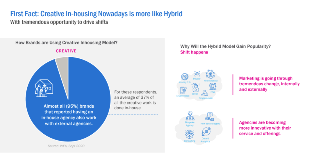 然而,市场营销无论何时都在经历着巨大的变化,代理商的服务和产品在创造性、灵活性及多样性等层面都在不断突破。而对于In-house团队来说,稳定且高效的特质也伴随着一定的局限性,在内部化的趋势下,In-housing所带来的问题也逐渐浮现。对于首席营销官来说,如何提升内部团队的创造性,来推动品牌效应,成为一大难题。