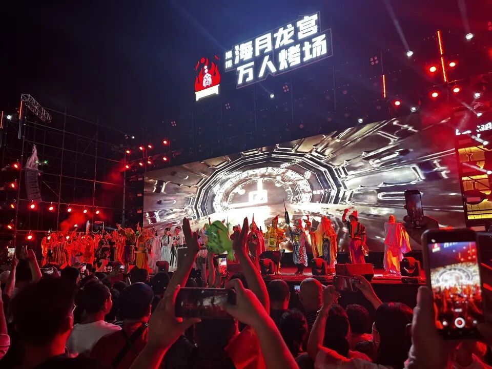 作为在“五一”前刚刚开业的烧烤城,海月龙宫聚集了大约30家烧烤店,分为东、西两区,每个区都配有一个舞台,这里远离居民区,乐队、DJ轮番上阵,让游客们的烧烤之旅拉满氛围感。