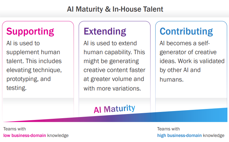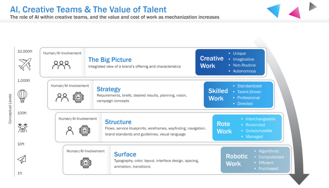 整体来说,赋有人工智能的创意平台,能够通过营销成本、多样化呈现和人群定位等层面来促进广告业的变革,使得创意生产被更加容易的获得。因此,对于市场主来说,被分散管理的小规模创意团队,变得更有吸引力。尽管人才成本和劳动力价格会随之下降,但对于如何选择合适的创意团队,其资源与要求将不可避免地提高。这将需要用到新的薪酬、绩效及管理评估模型。