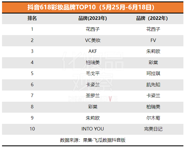 1、花西子蝉联。今年,抖音彩妆TOP1依然由花西子摘得,GMV同比增长44.35%。