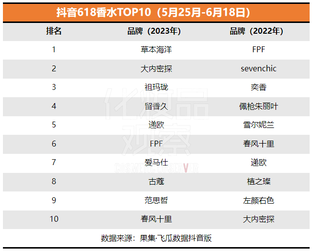 2、大洗牌。今年,抖音香水前十品牌经历大洗牌,不仅TOP1易主,TOP10品牌里,仅有4个品牌于去年挤进前十。