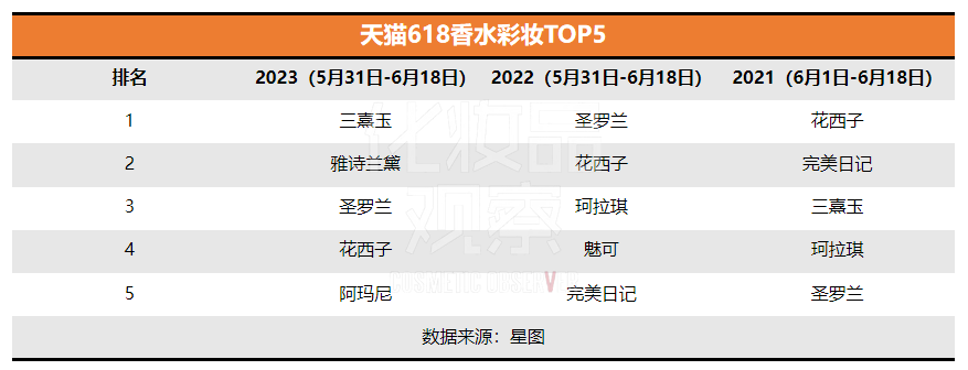 2、国货掉队。相较于前两年,今年618期间,仅花西子一个国货品牌挤进TOP5,而前两年出现在榜单里的完美日记、珂拉琪等均掉榜。