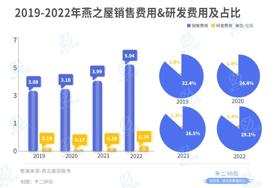 在「不二研究」看来,作为燕窝行业的26年老兵,燕之屋营收业绩可观,但高额的销售开支与低企的研发支出形成鲜明对比。