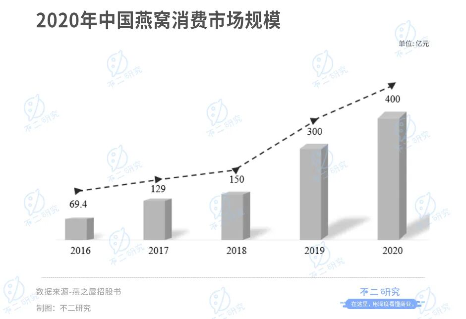 据国燕委发布的《2020年燕窝行业白皮书》,中国燕窝消费市场规模在2020年达到约400亿左右;约85%的燕窝品牌商运营线下渠道。