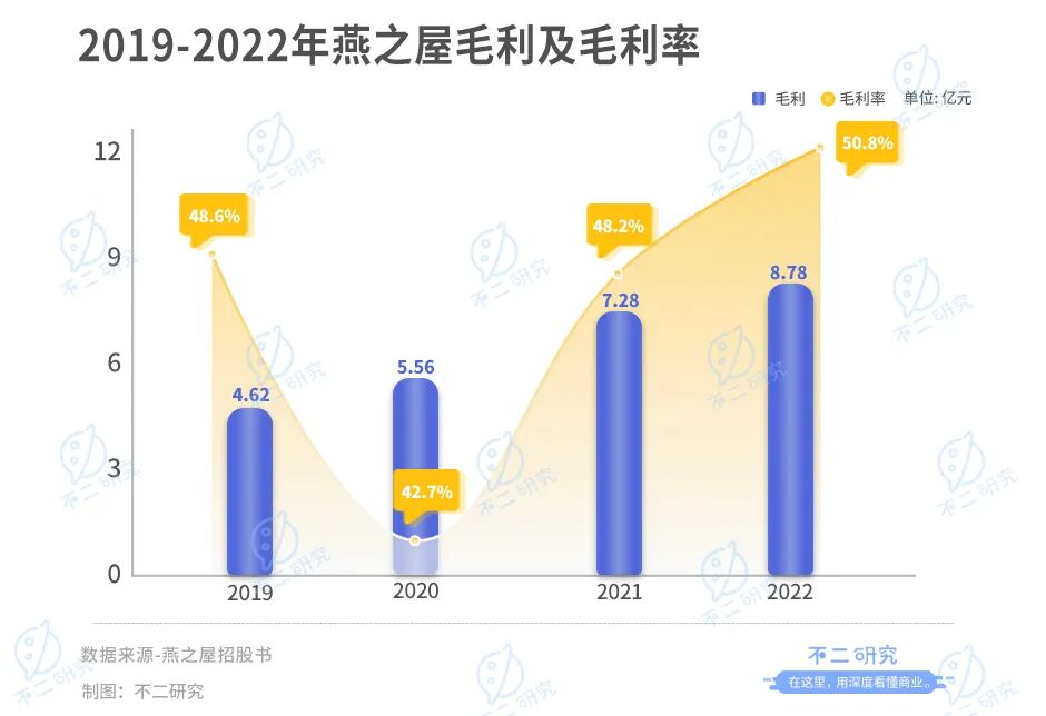 同期,燕之屋的毛利总额分别为4.62亿元、5.56亿元、7.28亿元和8.78亿元,毛利率为48.6%、42.7%、48.2%和50.8%。