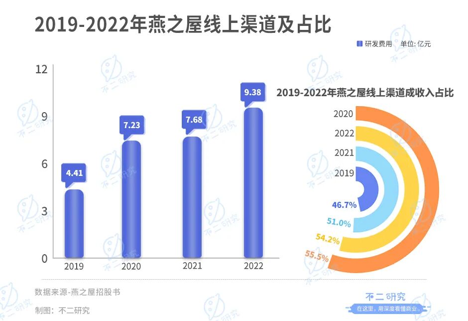 据燕之屋招股书显示,2019-2022年,其线上渠道的营业收入分别为4.41亿元、7.23亿元、7.68亿元和9.38亿元;营收占比分别为46.7%、55.5%、51.0%和54.2%。