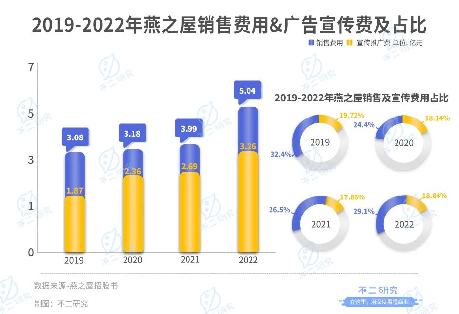 在「不二研究」看来,虽然燕之屋的营收平稳上升,或是依托于高额广告宣传费用,以营销增长换收入增长。