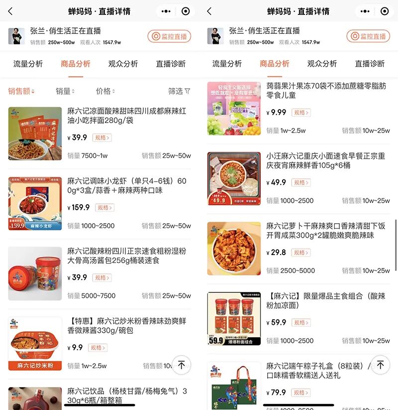 从销售榜单来看,基本以麻六记的产品为主,客单价也并不高。