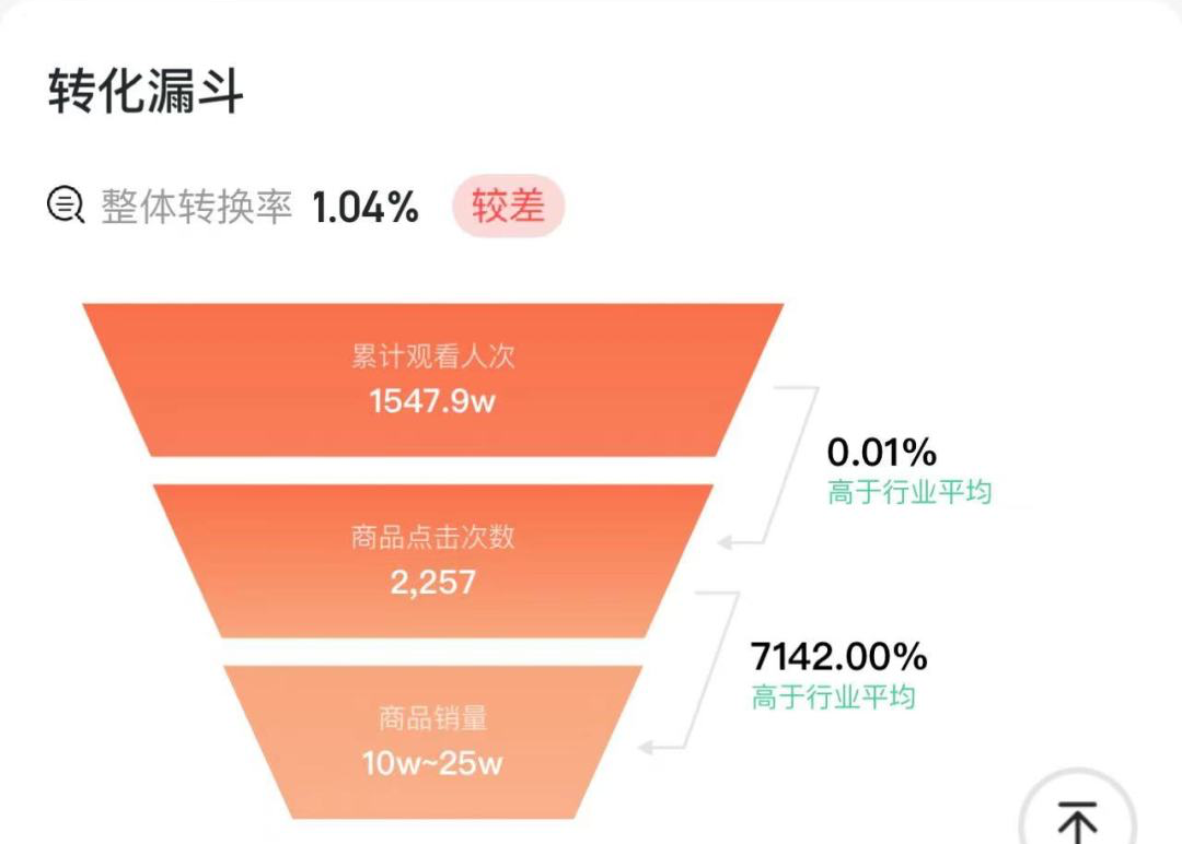 而这次呢,蝉妈妈的“转化漏斗”也指出,整体转换为仅为1.04%,较差。1500+万直播间观看人次,但产品销量只有10w-25w。