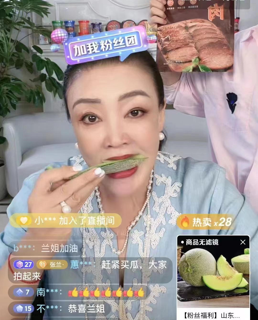 首先,张兰在直播间吃起了哈密瓜,暗示正在“吃瓜”。