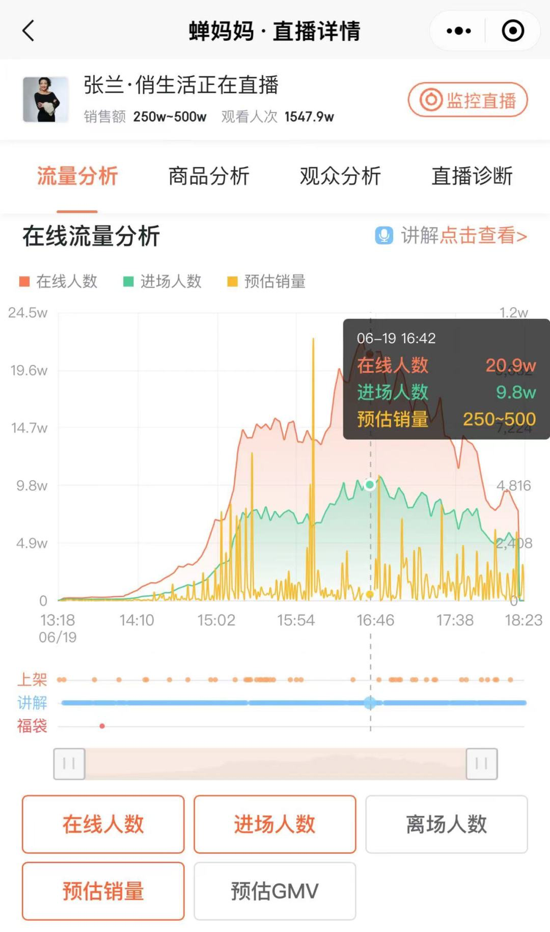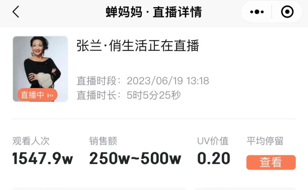 来自蝉妈妈的数据显示,张兰直播间在18点已突破了1500万人次,最高在线人数22万人次。