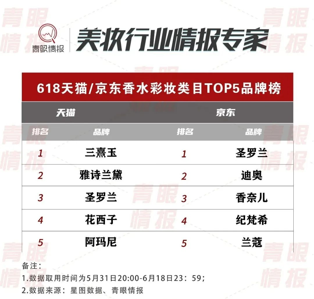 根据星图数据、青眼情报显示,今年618期间,天猫和京东美容护肤类目总GMV为300亿元。上榜天猫、京东美容护肤类目TOP5的品牌共有6个,珀莱雅是唯一上榜的国货品牌。