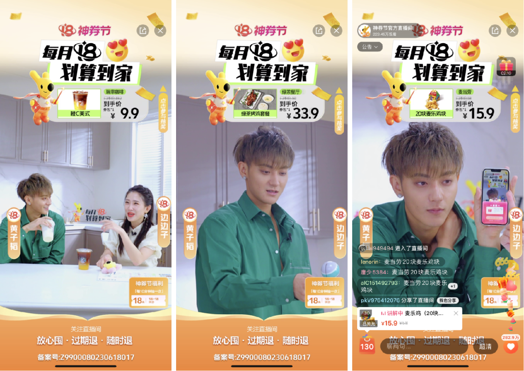 直播间准备的游戏环节也没能难倒黄子韬,完美通关为直播间粉丝争取到了福利。放话要“薅空美团外卖神券节”的黄总,不仅为直播间粉丝们多争取到了3000份的15.9元20块麦乐鸡块套餐,离场时还遗憾表示“福利可以再多一点”。同时美团外卖神券节简单直给的优惠信息,以“直减18元”为例的价格锚点,配合黄子韬和主播详细的说明展示,让用户进一步确认了自己能获得的优惠,真切地感受到了「省」。