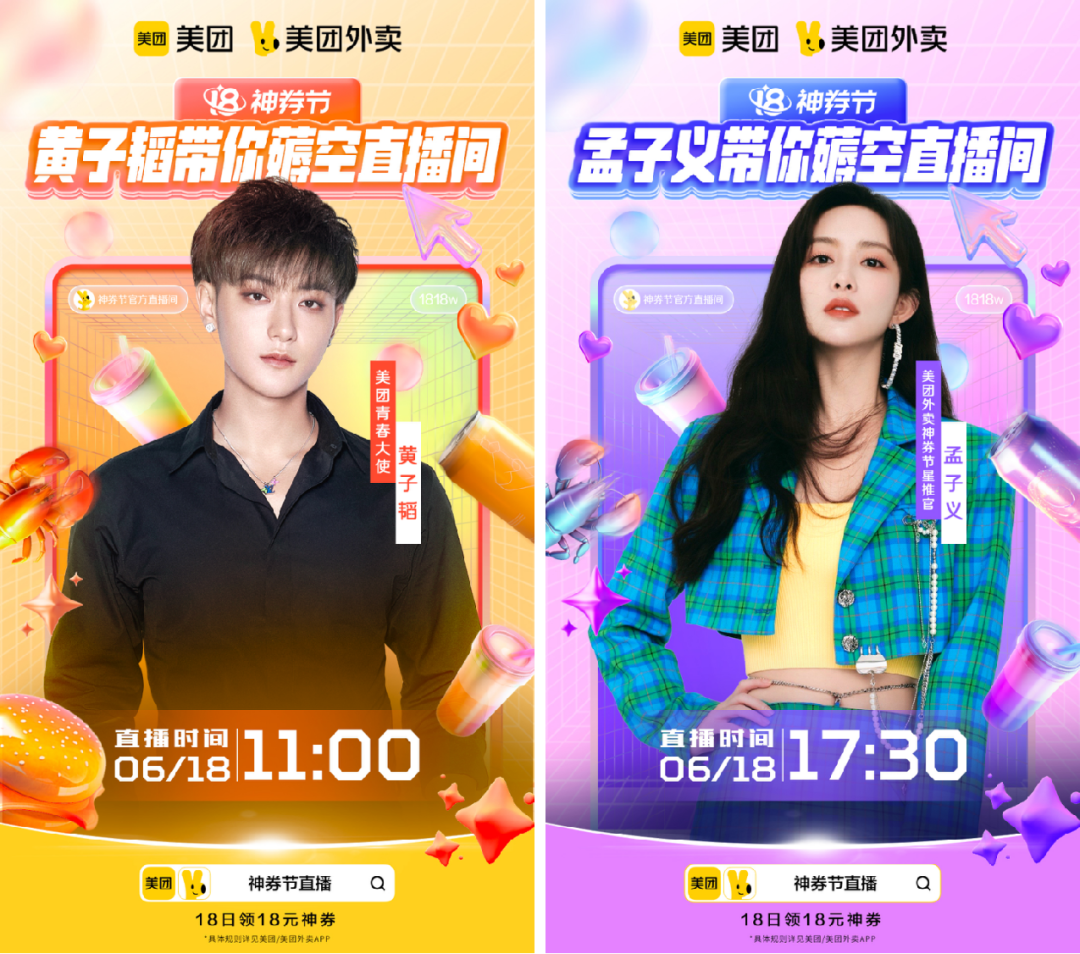 首次入局“618”的美团外卖,以神券节直播为核心阵地,在稳扎稳打地整合站内资源、开放站内会场的同时,携手美团青春大使黄子韬、美团外卖神券节星推官孟子义等明星及美食达人,在“618”当天开启全天直播,明星阵容加上众多优惠福利,吸引大量粉丝及路人互动参与。
