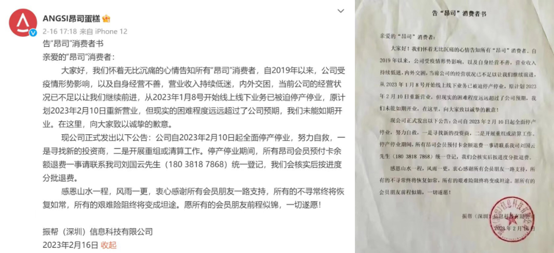 黄金地段、高昂造价、明星站台的昂司烘焙最终没能活过第5个年头,在今年年初昂司蛋糕官方宣布全面停业停产、准备重组清算。