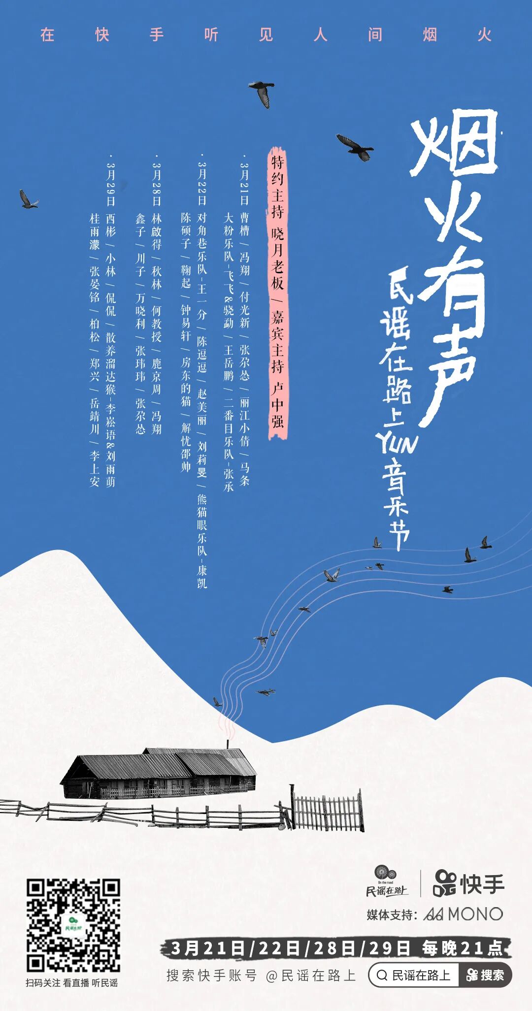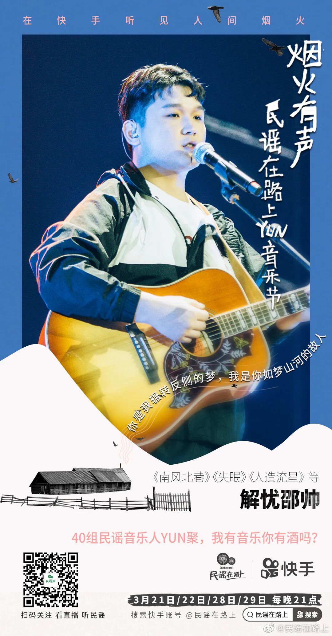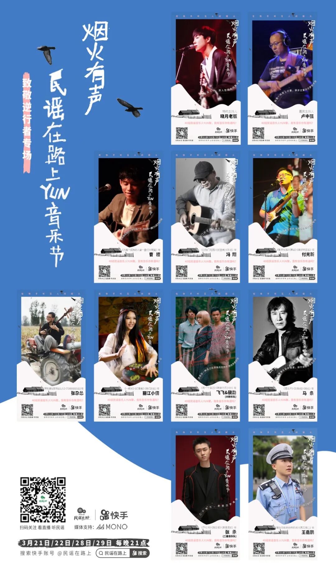 「民谣在路上YUN音乐节」是民谣在路上联合快手主办的大型线上直播活动,为期两周,开播四天。在快手APP,40组民谣音乐人YUN聚会,横跨00后至70后的代表性民谣音乐人在线演出。根据官方介绍,音乐接的阵容模拟真实音乐节,不录播,“不掺水”。
