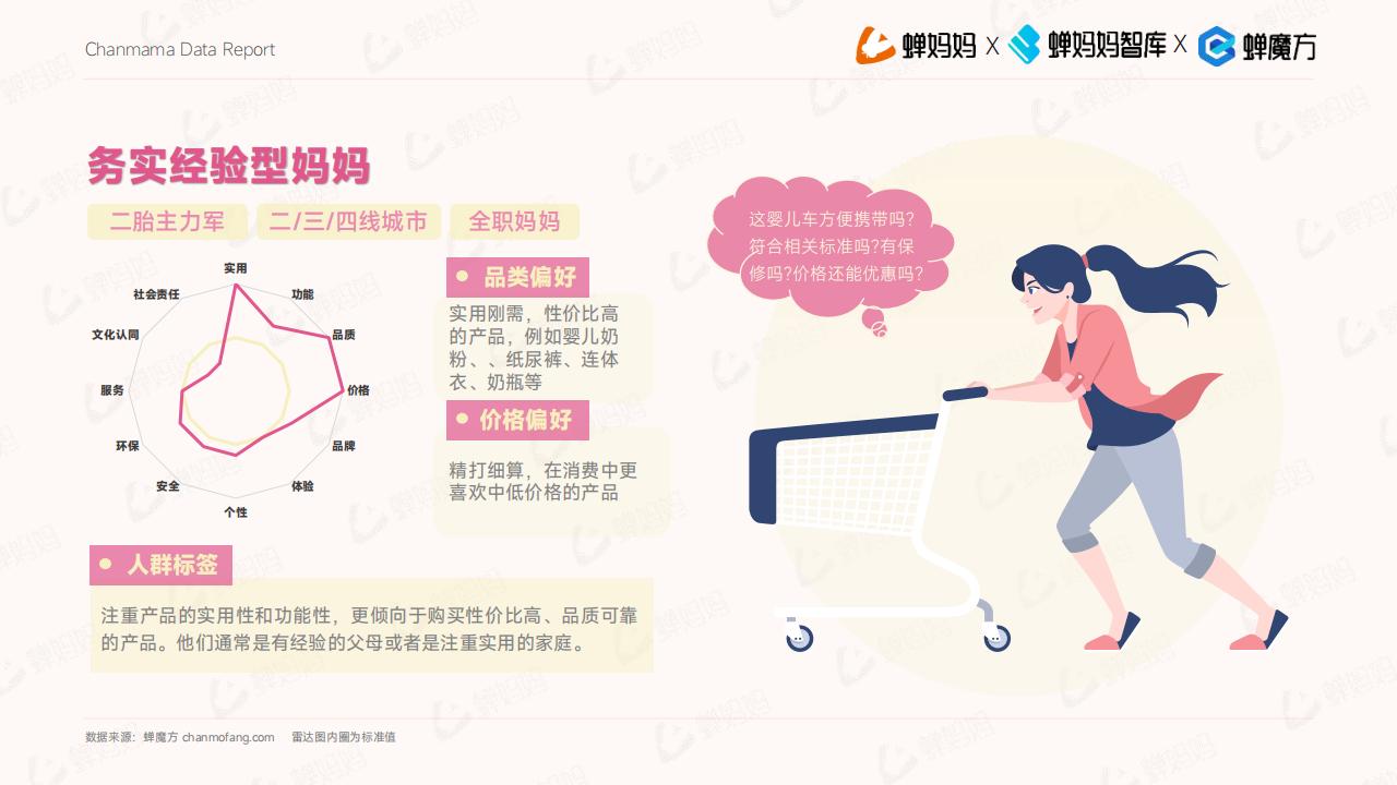 报告同时刻画了母婴行业的消费者画像,可以将其分为六个类型:务实经验型、精致品控型、品牌忠诚型、悦己享乐型、环保健康型和安全保障型。不同类型的消费者对产品的需求和价值观有所差异,因此企业应该根据不同类型的消费者进行差异化的市场定位和营销策略。