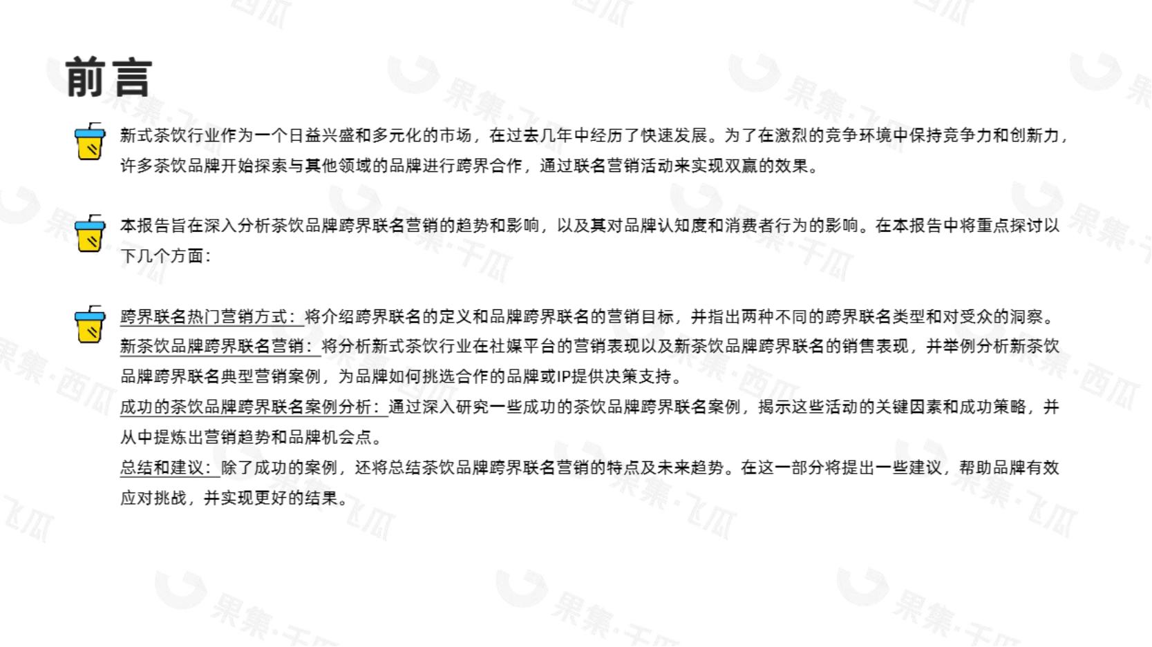 新式茶饮行业作为一个日益兴盛和多元化的市场,在过去几年中经历了快速发展。为了在激烈的竞争环境中保持竞争力和创新力,许多茶饮品牌开始探索与其他领域的品牌进行跨界合作,通过联名营销活动来实现双赢的效果。本报告旨在深入分析茶饮品牌跨界联名营销的趋势和影响,以及其对品牌认知度和消费者行为的影响。
