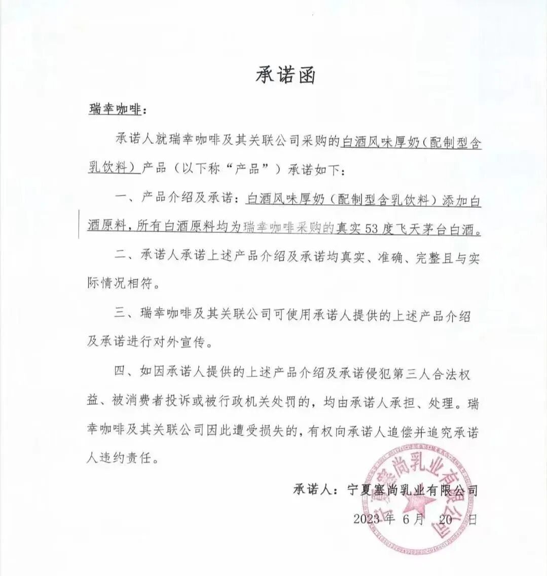 后来,瑞幸这款酱香拿铁的供应商宁夏塞尚乳业更是发承诺函: