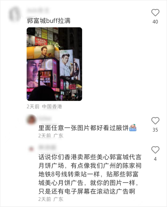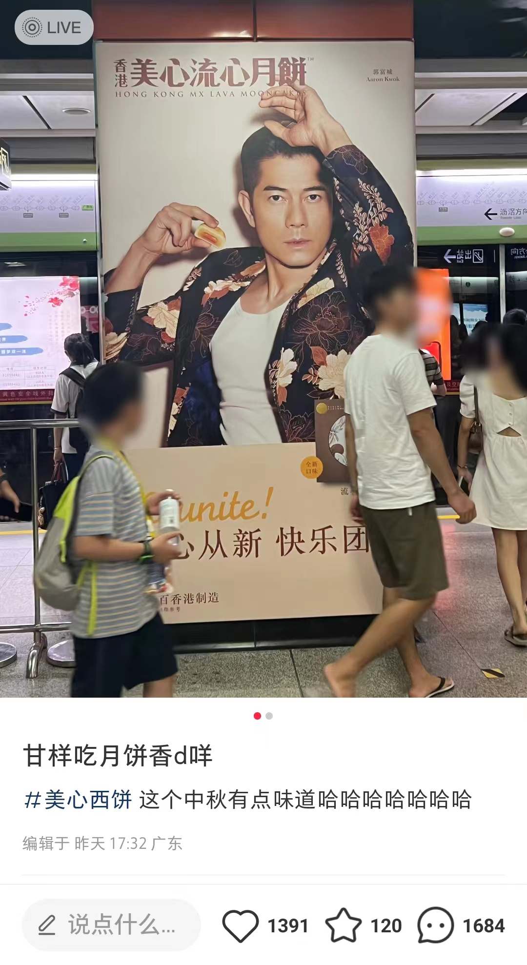 至于引发争议的“流心奶黄月饼”的宣传海报,在社交平台也掀起了一股小小的二创风潮。甚至有网友甚至专门前往广告投放的位置与郭富城的海报合影留念。