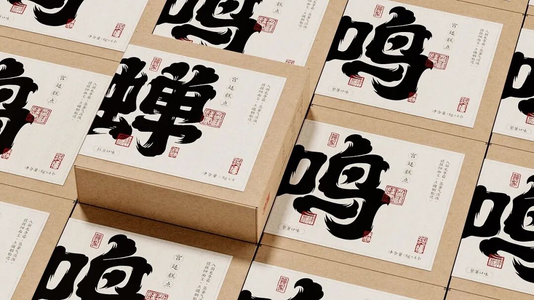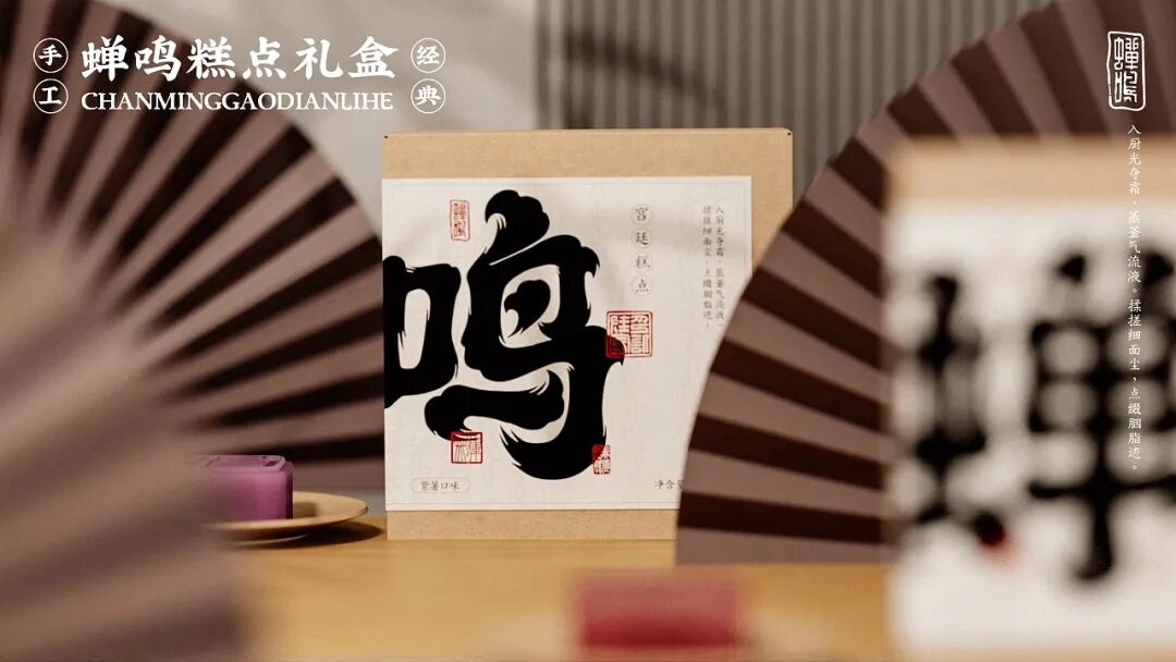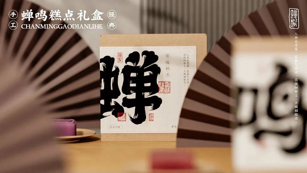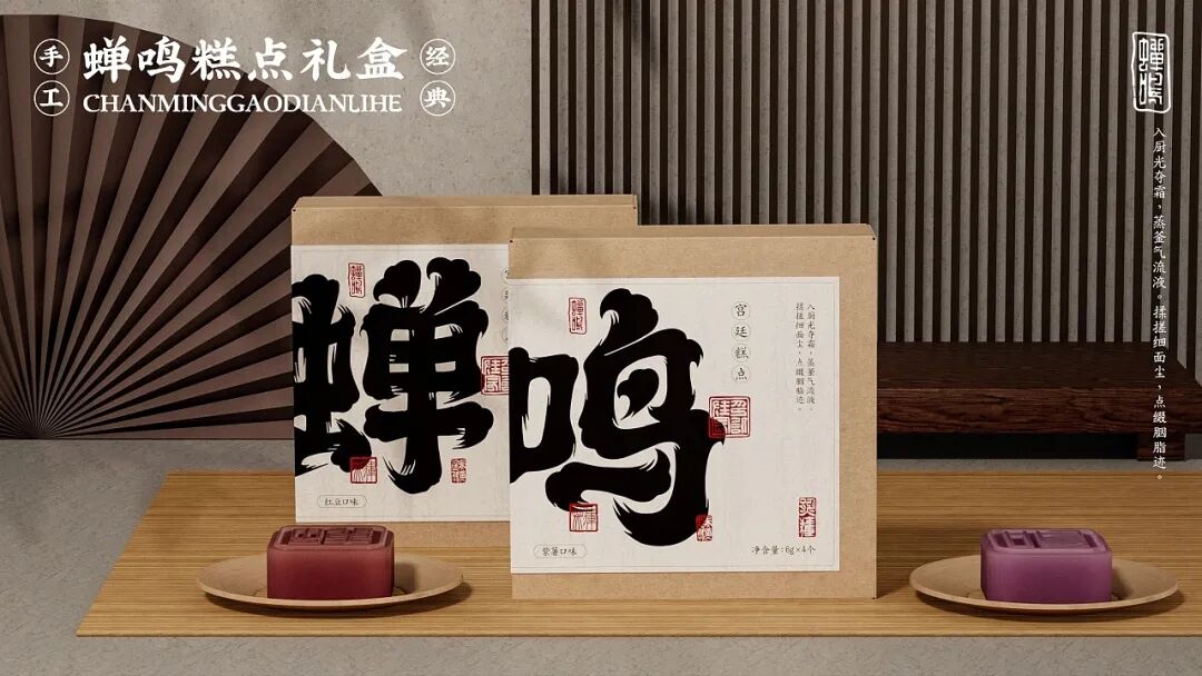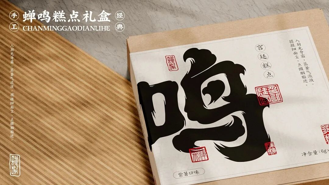 接着这款古风气息满满的蝉鸣糕点礼盒,产品名“蝉鸣”采用书法体设计,并通过放大处理作为视觉锤,突出品牌记忆点,字体周围的印章点缀进一步彰显其传统意象。