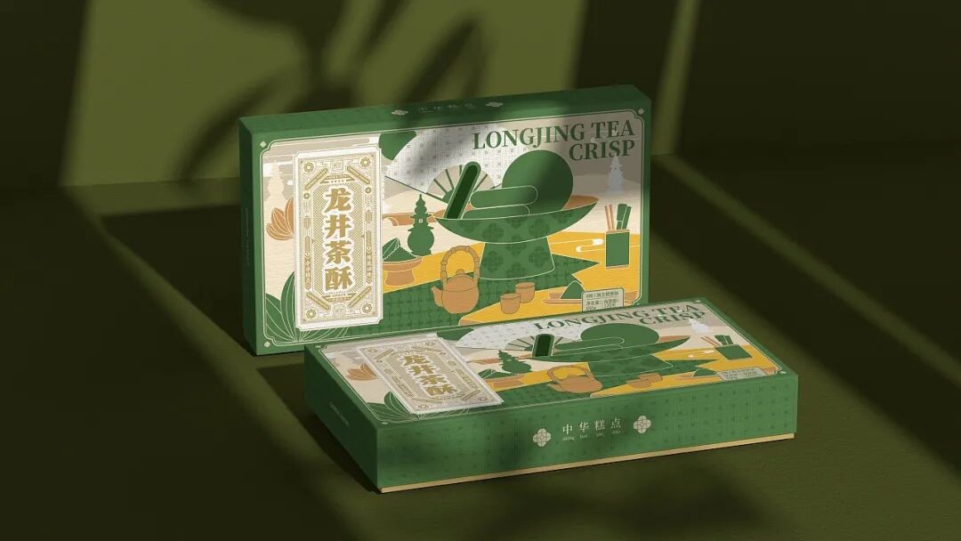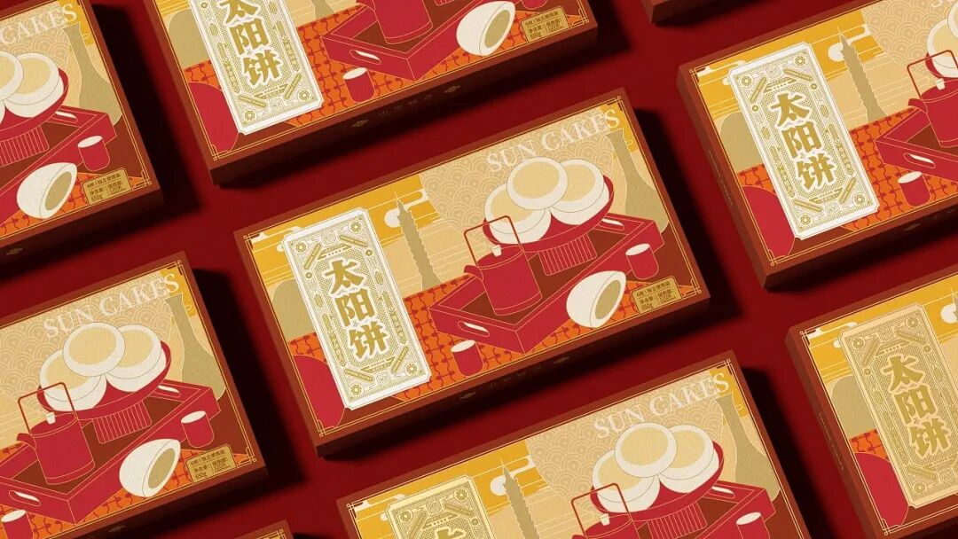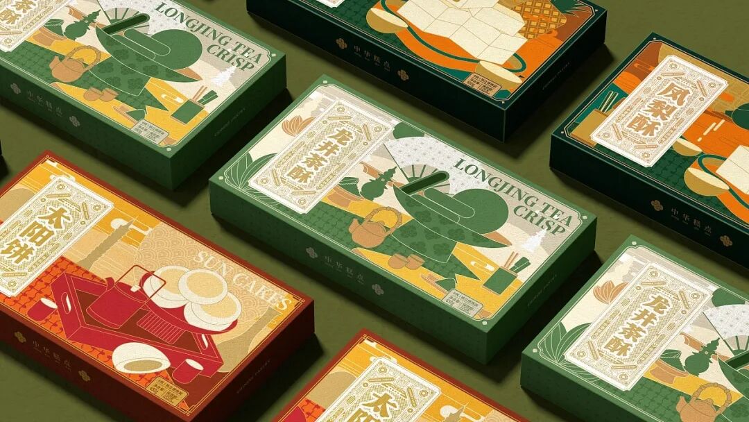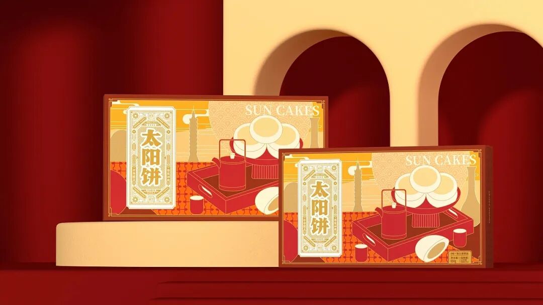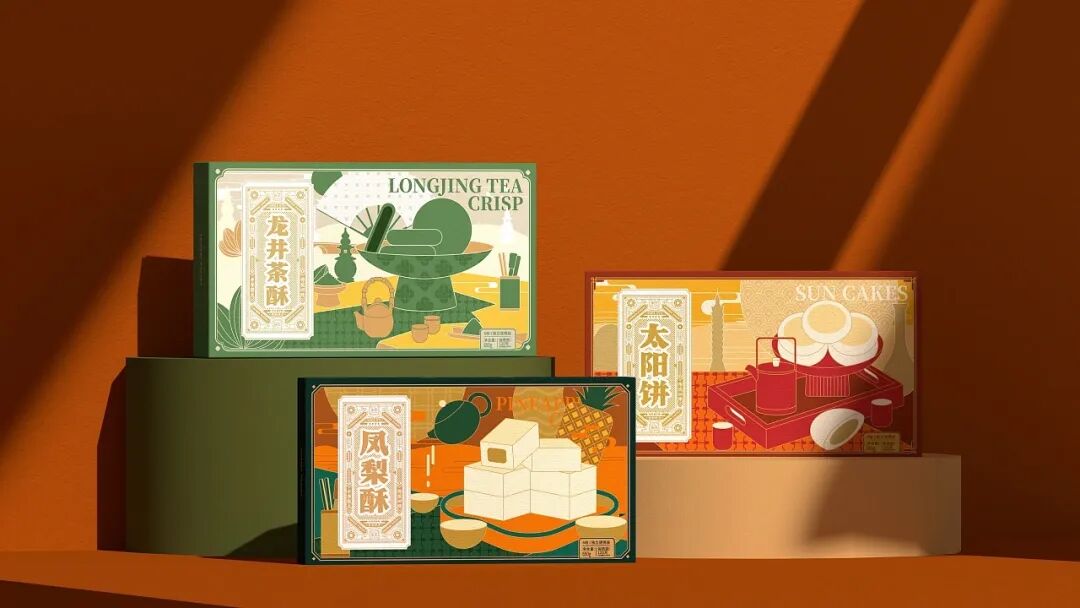 最后这款中华糕点系列,整个画面内容采用一致的中式茶食场景进行绘制,并根据太阳饼、龙井茶酥、凤梨酥等不同产品做对应的主题输出,打造更沉浸式的场景体验,同时直观展示产品属性,便于用户区分。