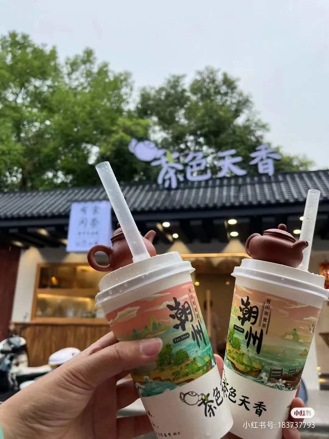 比如潮州有一家叫“茶色天香”的门店,店名和包装都很像茶颜悦色,但杯顶的小茶壶,就完全打出了差异化。