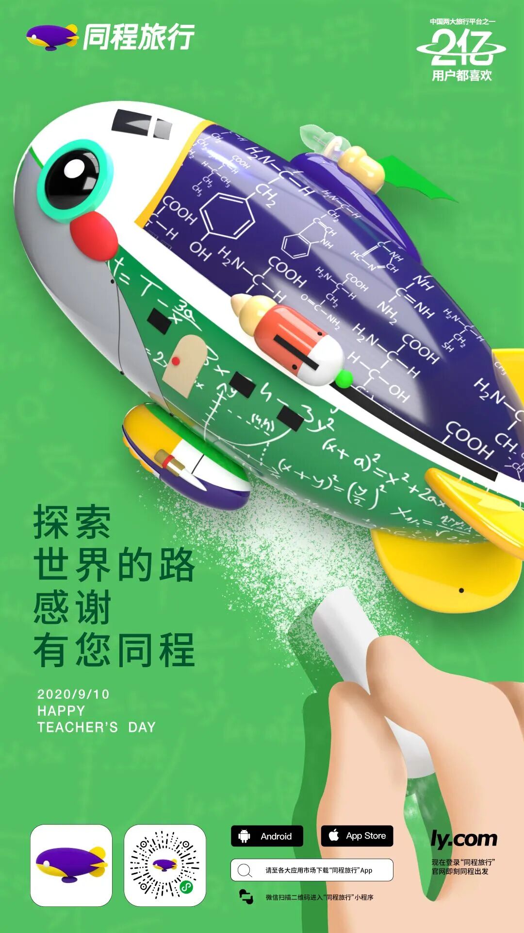 这句文案涵盖了两层含义,一是学生时代,在知识海洋的世界中是有老师一直陪伴引领我们;二是走出校园步入社会中,来来往往的旅途中都有同程旅行的陪伴。