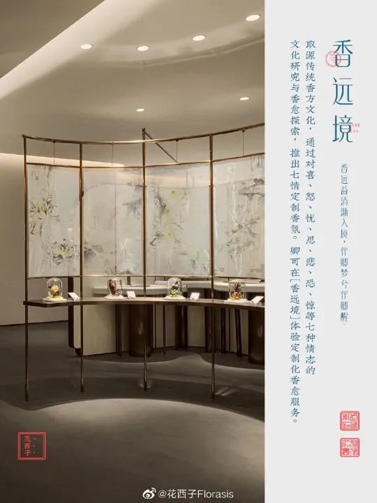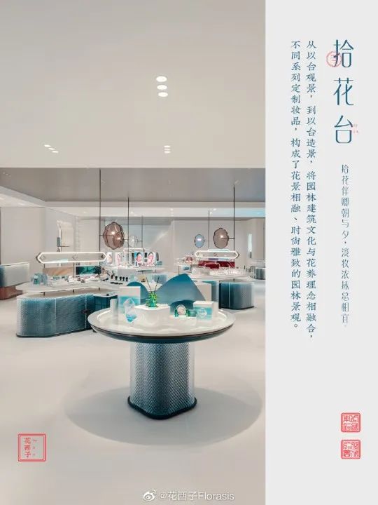 国货美妆品牌花西子也在积极探索线下门店的创意空间表达。在花西子首家线下体验店中,品牌延续东方美学的文化基因,结合在地文化,打造了一个艺术馆式的美妆花园。
