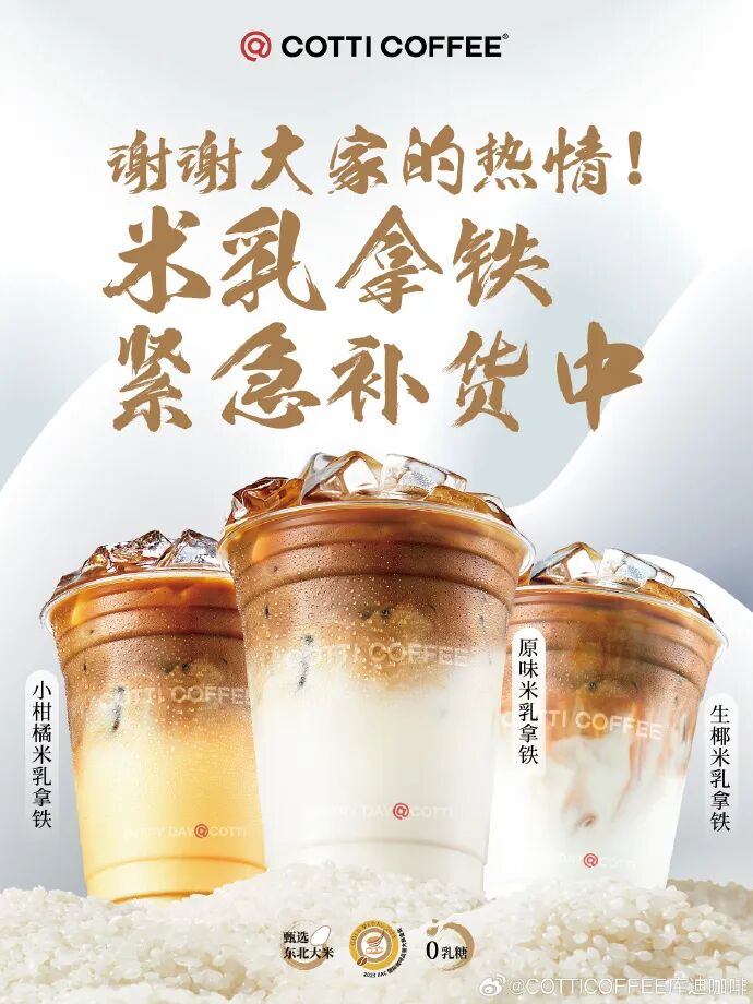 后有瑞幸的“对头”库迪咖啡联合五常大米,推出「米乳拿铁」。