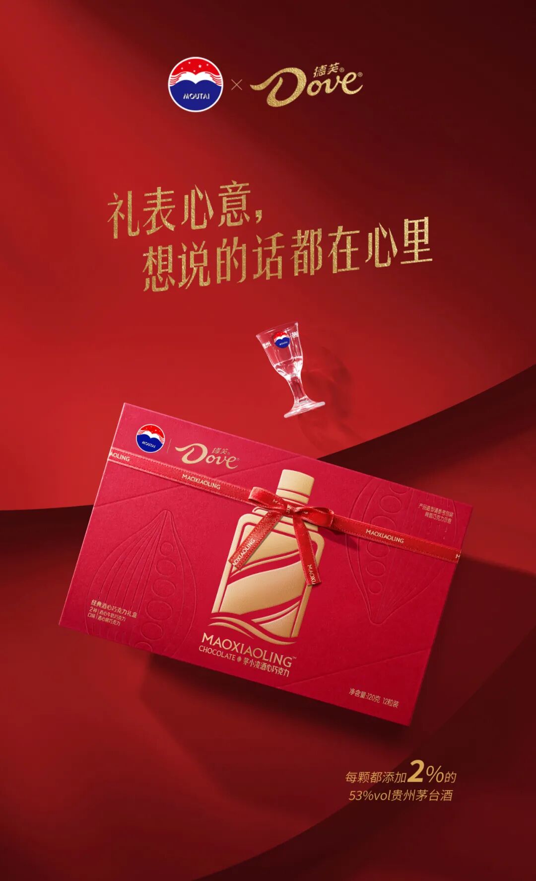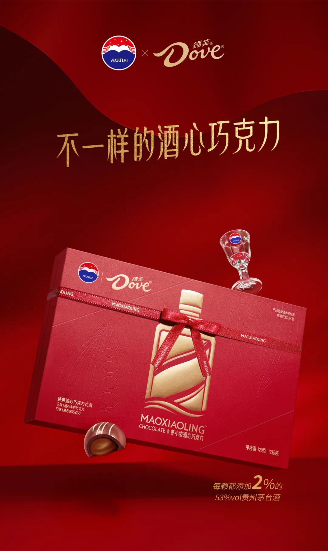 礼盒的视觉中心是以茅台瓶子形状为主,瓶身描绘出德芙巧克力的设计。版面的四角是联名的LOGO和物品信息,其中礼盒还用红色带子打了蝴蝶结的样式。
