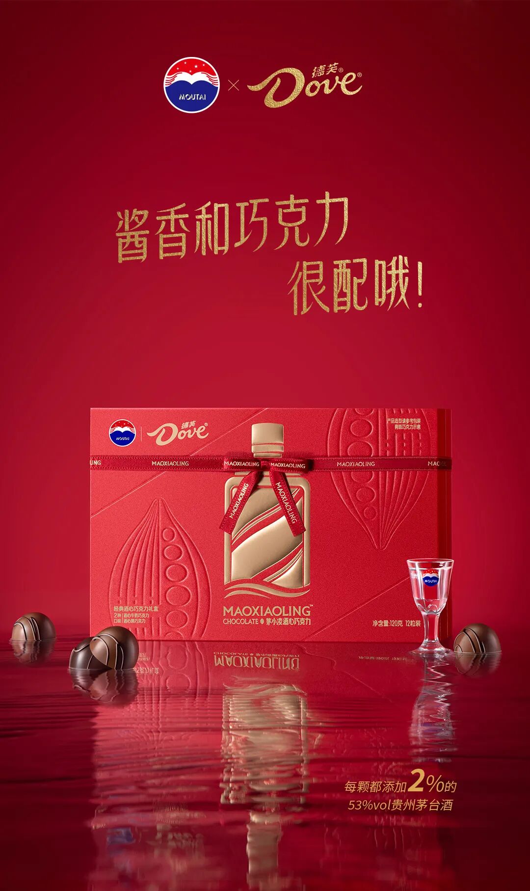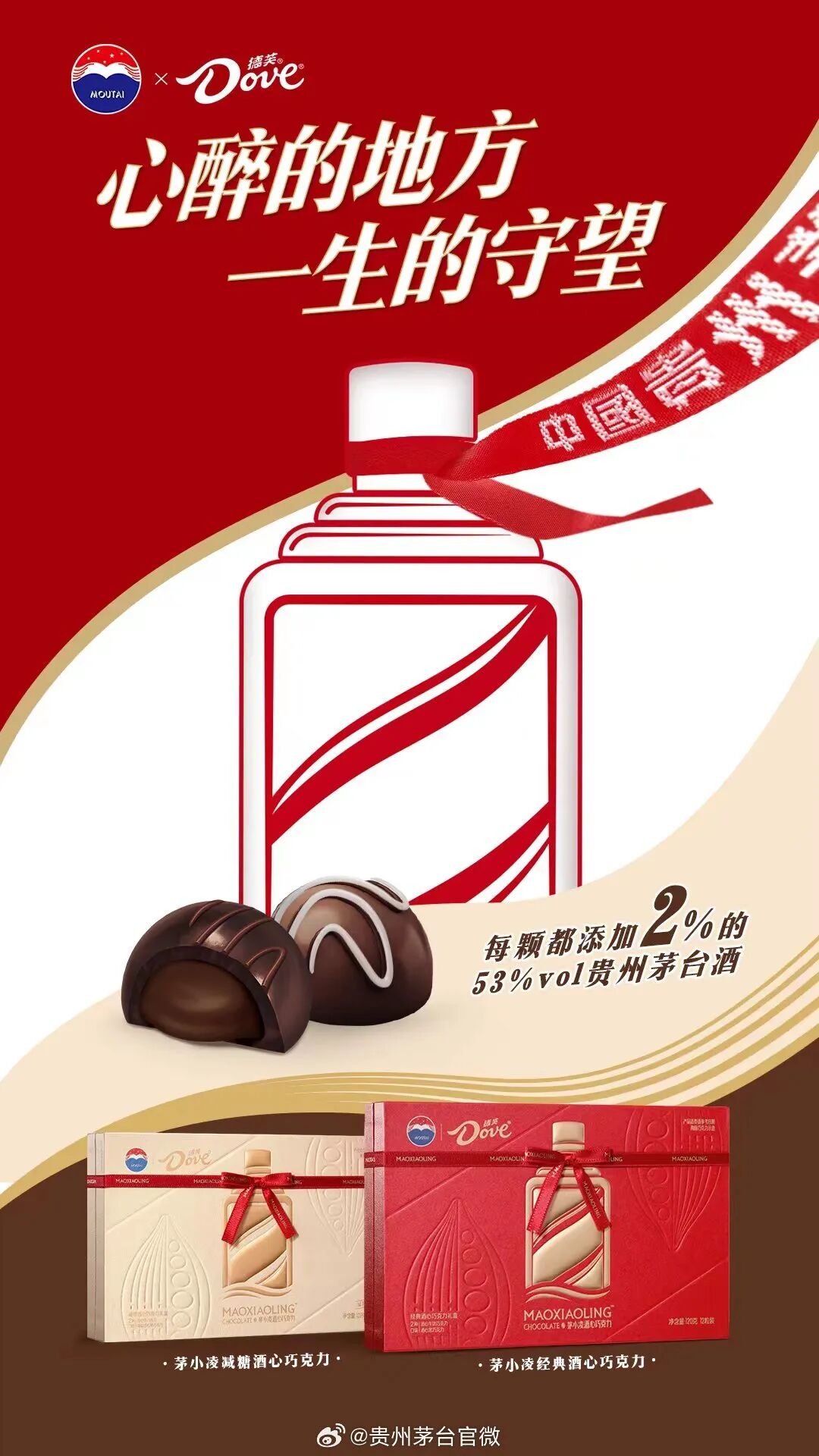 之后贵州茅台和德芙直接官宣,推出新品酒心巧克力。两张海报分别提取了茅台和德芙的标准配色,心形的造型上是茅台的瓶子、德芙的丝滑的带子。