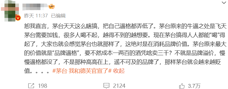 但另一方面,有人却觉得茅台的联名行为是在拉低自己的档次。