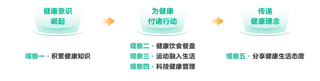 基于此,巨量算数清晰描绘出当代健康生活新范式,将大众追求健康的多样化路径与方式,系统性地归纳为“健康意识觉醒”、“为健康付诸行动”、“传递健康理念”三大阶段,并着重讲解了平台对不同阶段人群的行为观察。