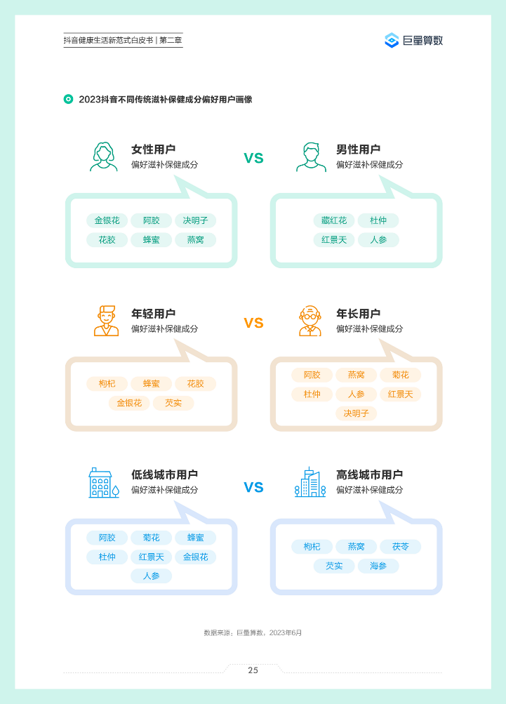比如在健康学习方面,有高达79%的抖音用户倾向于通过短视频获取健康知识,且越来越多用户偏好容量更高、信息量更大的中长视频健康科普内容,从而带动了抖音医疗健康科普内容生态的繁荣发展。而在行动阶段,白皮书显示“健康饮食、吃出健康”加速成为大众普遍需求。同时在中国保健品市场规模持续增长的背景下,巨量算数还从多个维度勾勒出了清晰的传统滋补保健产品用户画像。