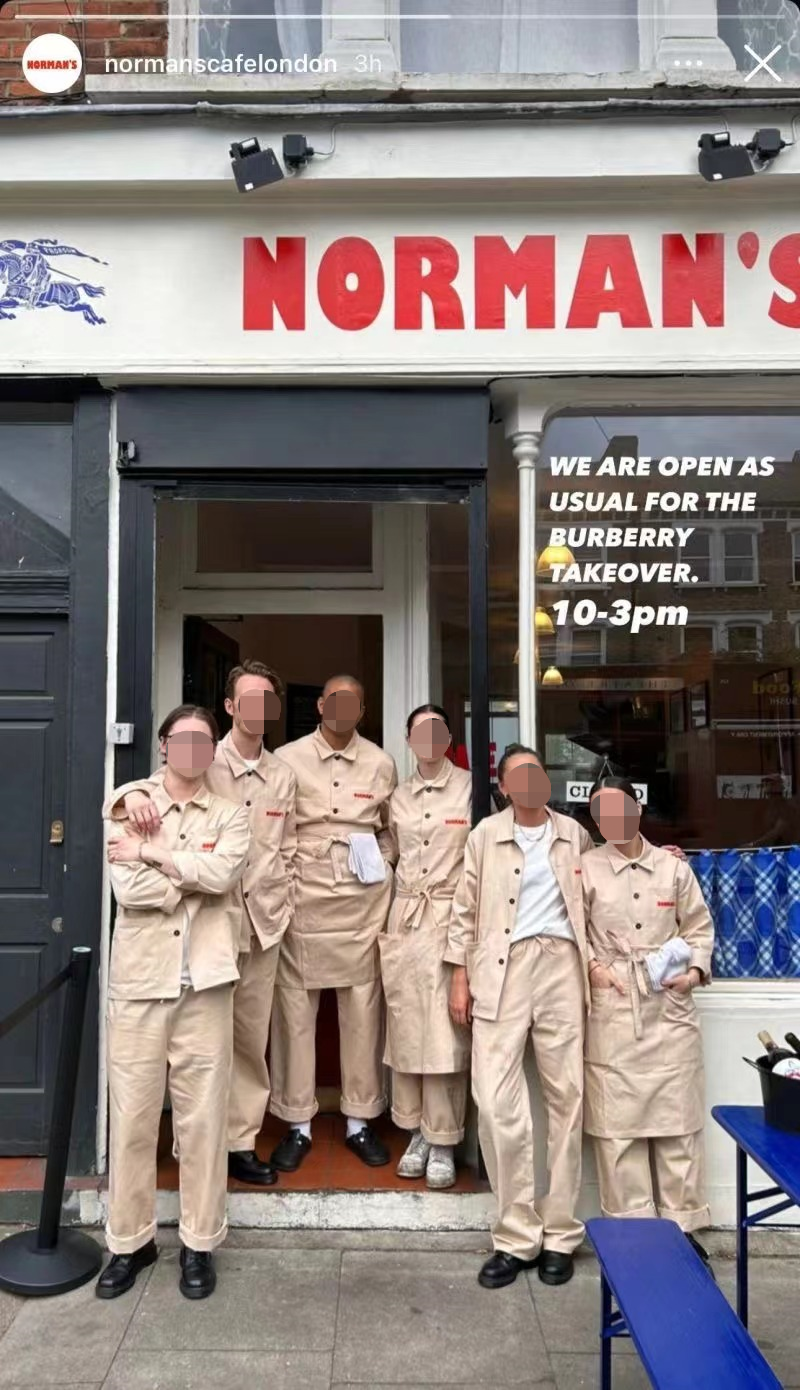 海外的网友发现,位于伦敦北部的一家地道的咖啡馆Norman's Café,摇身一变成为Burberry的早餐店。