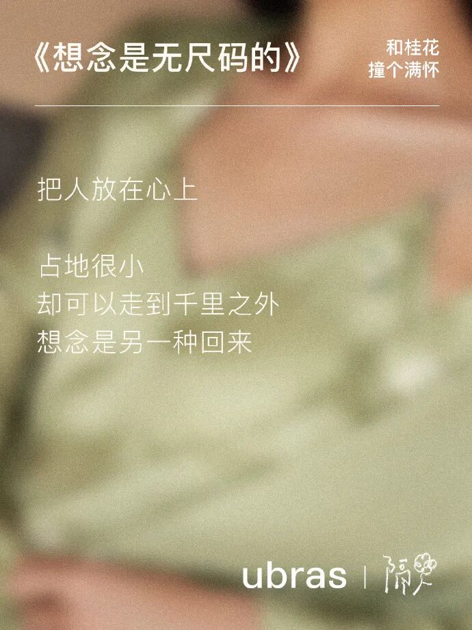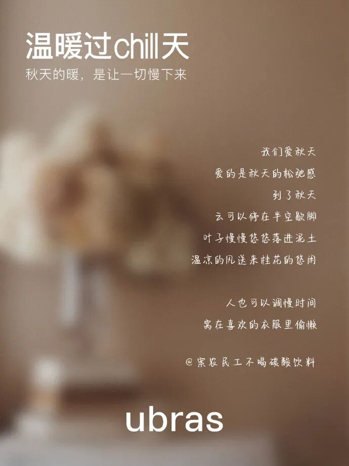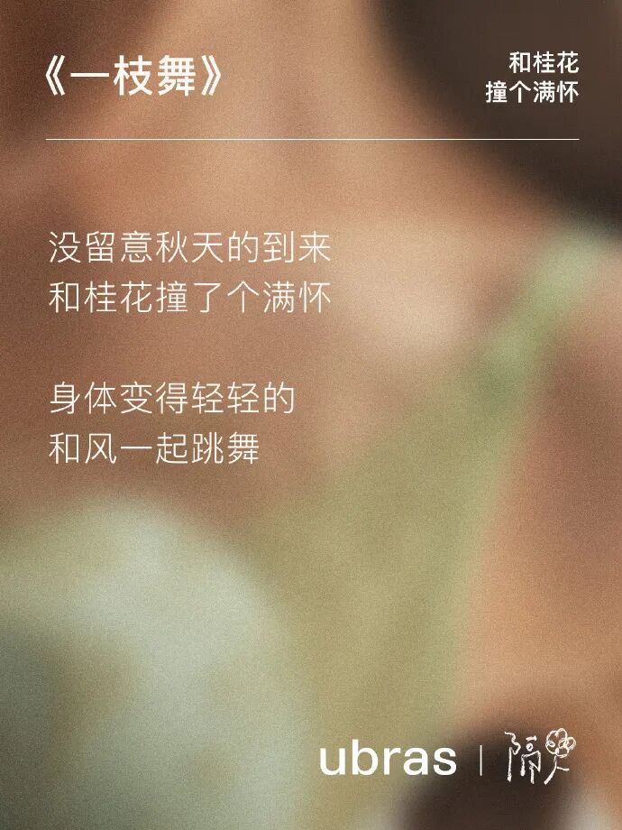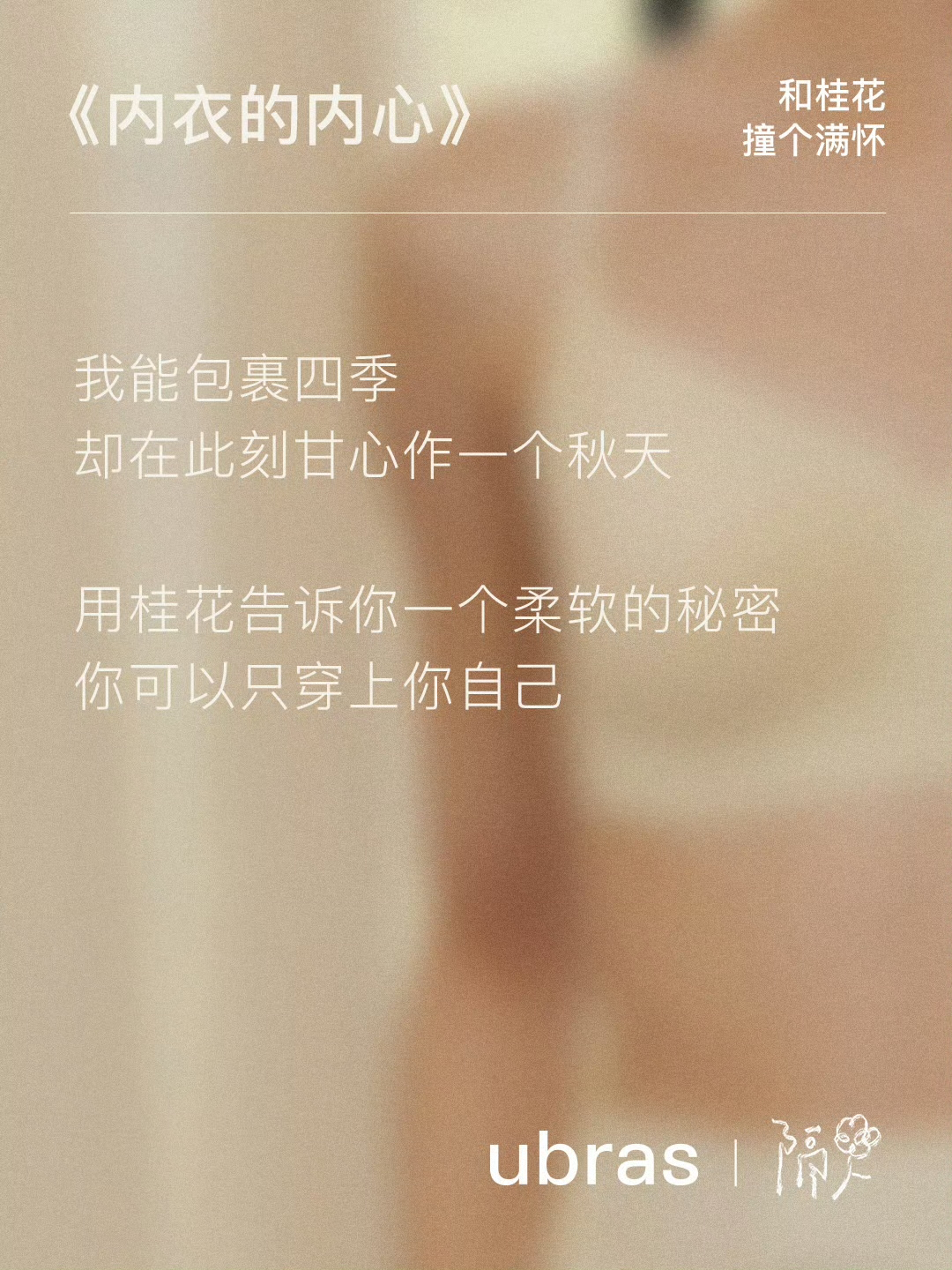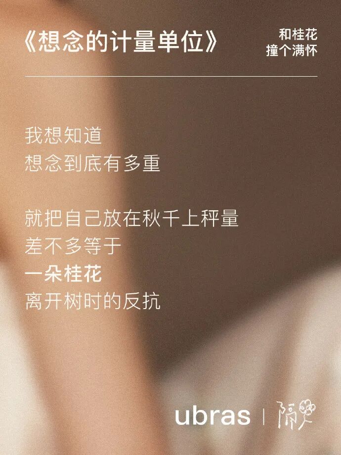 对于打工人而言,是通勤地铁上让人起鸡皮疙瘩的冷气,是午后小困也不加冰的温热奶茶,是夕阳西下办公室窗外飘落的秋叶……这些生活中的细碎瞬间,总让人第一时间感知到秋天的来袭。随着秋意渐浓,品牌纷纷吹响秋日营销的号角,或是借秋景抒乡愁,焕发用户的心灵共鸣,或是季节性上新,开启秋天的正确打开方式,邀请用户一起走进品牌的秋日世界。ubras则是两者兼备,推出国风金桂、奶嘟嘟、温暖过chill天等秋日新系列,用文案给产品注入秋天的诗意,将秋色玩出了新花样。ubras联合小红书上走红的野生诗人「隔花人」,为桂花系列作诗,围坐在桂花下,将诗意穿在身上,包裹一场不限花期的想念,拉满秋日氛围感,给产品平添几分秋色。5首随笔小诗,以秋日里的感官情绪为出发点,道出了秋天所承载的乡愁、松弛感、轻盈等等多面感受。简单的笔触勾勒出人们眼中不同的秋日景象,同时也将ubras桂花限定新品的轻盈重量、无尺码、舒适感等产品卖点一一释出,自然又不显突兀,用秋意衔接相当巧妙。在金桂系列设计理念的阐述中,ubras把桂花视为秋天的“代言人”,代表着乡愁和想念,给产品赋予情感灵魂。以此唤醒人们的秋日记忆,建立新品与秋天的缕缕强关联,将秋意藏于每一件贴身衣服中,用秋日“添衣”传递爱和温度。为了强化品牌的温度,让用户具象化感受秋天的温暖,ubras向用户征集秋天文案,分享秋天带来的温暖记忆,进一步加深用户对品牌的形象和认知,拉近与用户的心理距离。爱上秋天,不仅仅是怀念记忆深处的秋日记忆,惬意温柔的秋风、簌簌飘落的秋叶、以及恰到好处的柔和阳光,都让人倍感治愈,宛如一处能量补给站,舒缓人们紧绷的神经,带来由心而发的松弛感。除了品牌诗歌和网友共创外,ubras的产品宣传文案同样饱含馥郁秋意,捕捉秋日里的温暖情景,以此类比产品的舒适功效,充满秋日意境之美。不需要华丽的辞藻,冗长的篇幅,寥寥几笔就能让人把秋天的柔和阳光、秋风吹拂泛起的层层涟漪等美好静谧的秋日场景,与ubras新品联系起来,潜移默化中植入用户心智。即使是简单的表情包搭配成语,也能从文字和画面中get到秋日专属的舒适感。可爱的充满网感的口吻,提升表达趣味,更能打动人心。纵观品牌的秋日营销战役,围绕桂花和秋日意境讲述的不在少数。ubras将两者完美融合,挖掘秋日里的治愈瞬间、温暖记忆等等,具象化诠释秋日景象,用文案实现广告移情,塑造品牌质感和底色,给人留下了深刻的品牌印象。